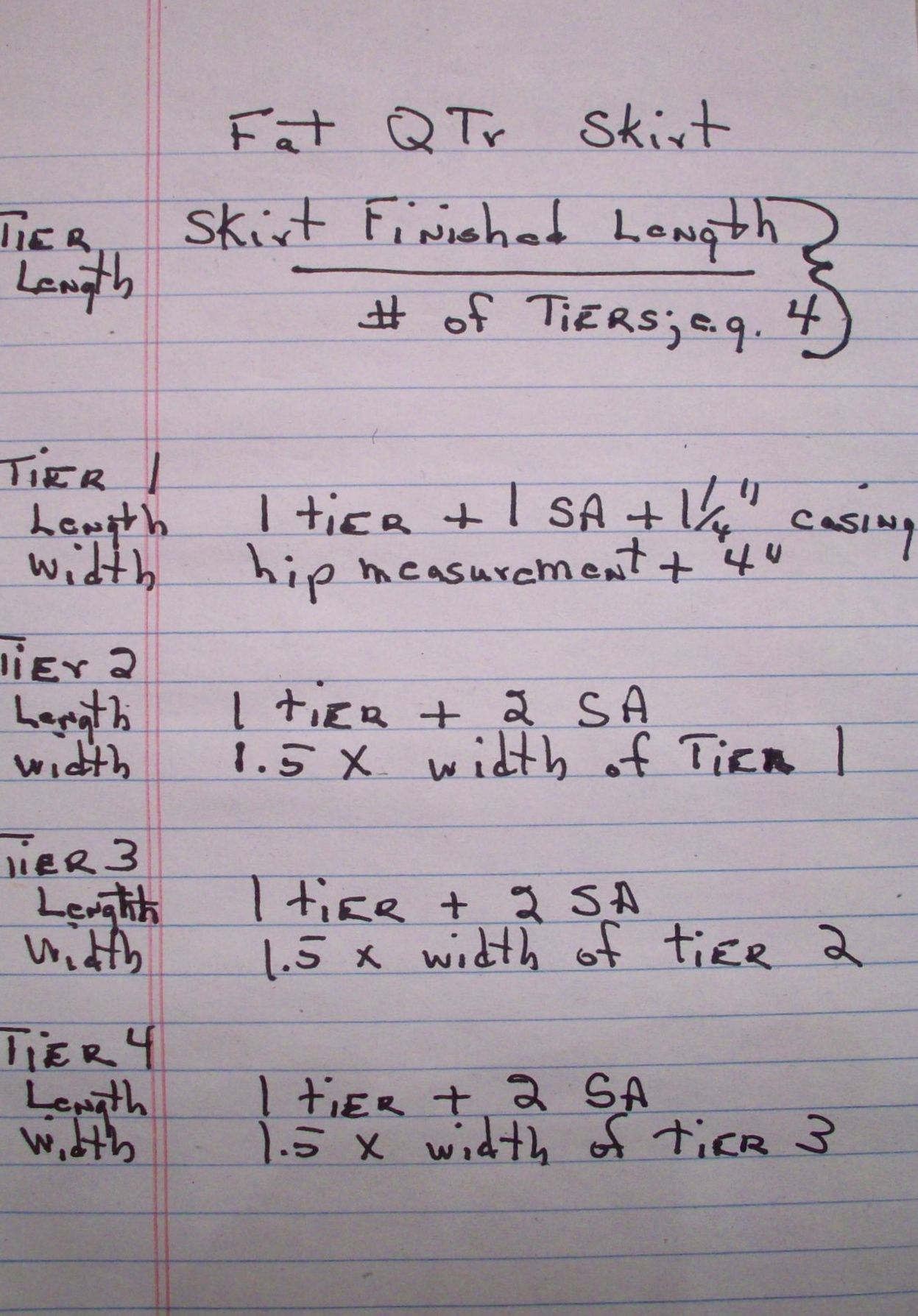 Divide the finished skirt length by the number of tiers you want in the skirt; I did four tiers. This is the length of each tier; total length of all tiers equals finished length of skirt