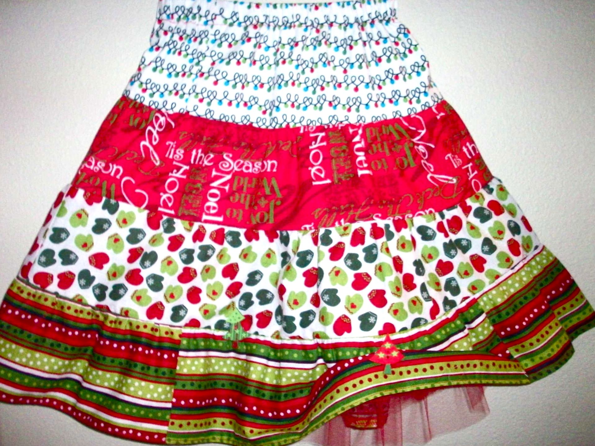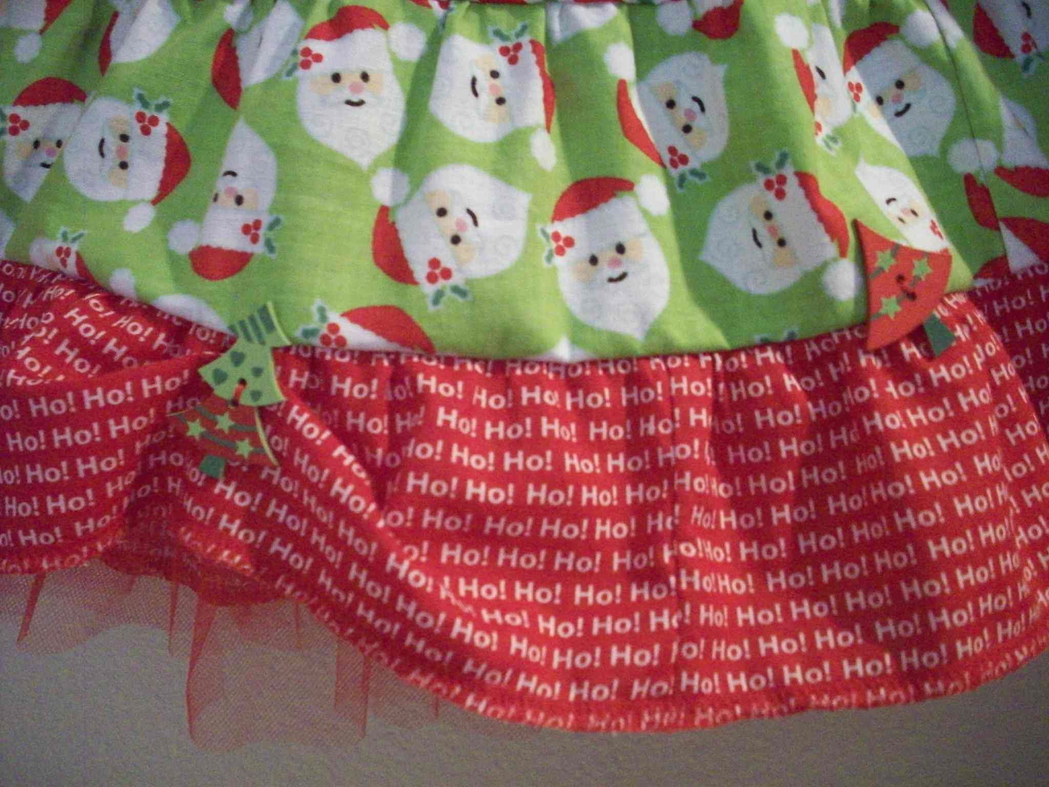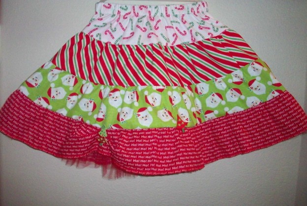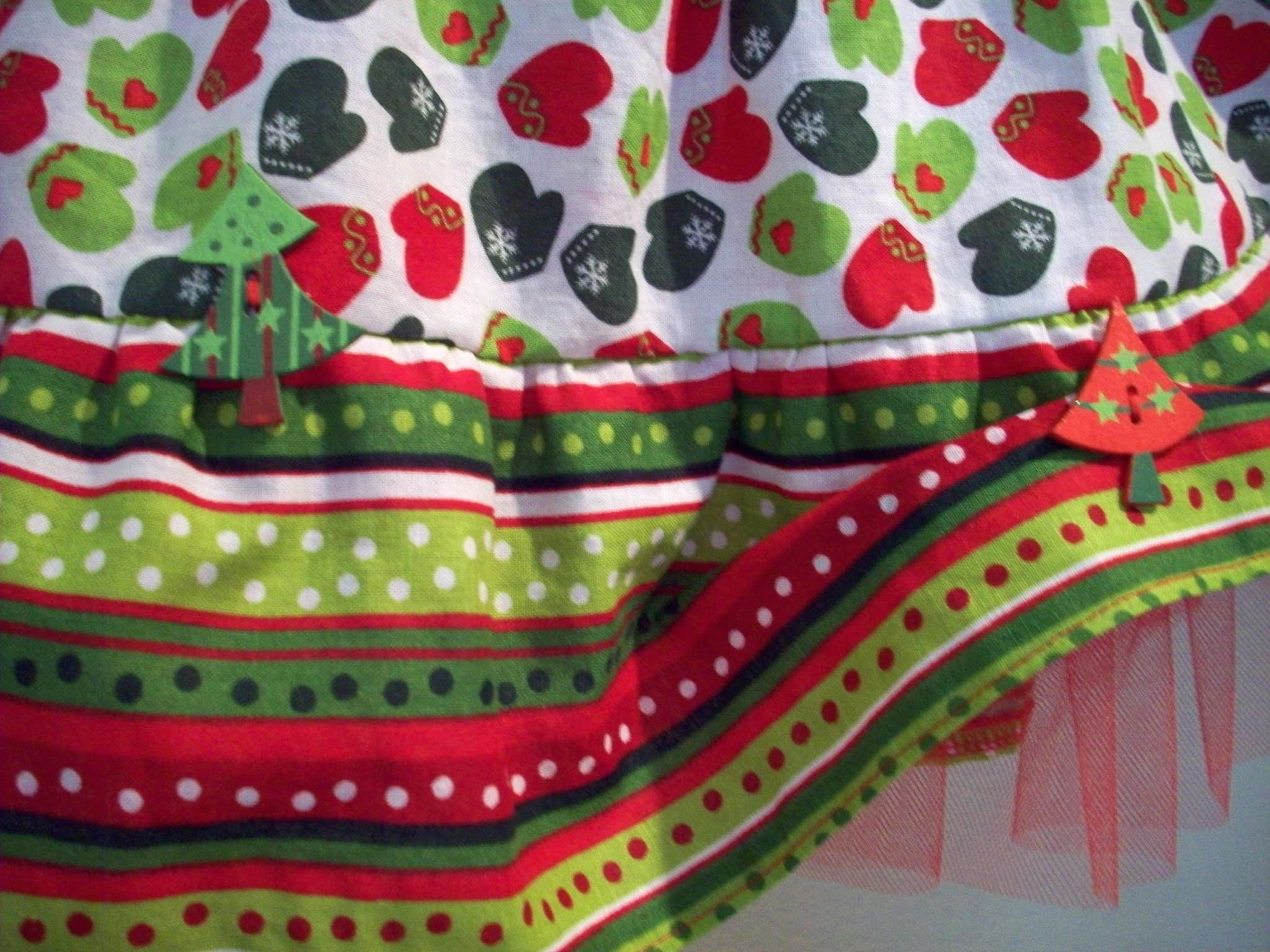Here are the two finished skirts–size 4 and 6. Had a package of Christmas Tree buttons on hand so added them to the skirt