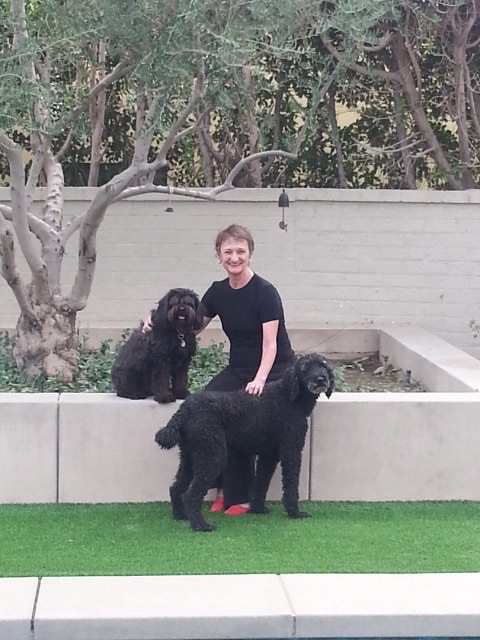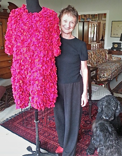 | So, when in Palm Springs, CA, last month, stopped by for a visit with Claire at her home and was happy to meet the dogs, Oscar and Libby, Louise, who helps with the couture collection, and view another of Claire’s passions–Art.