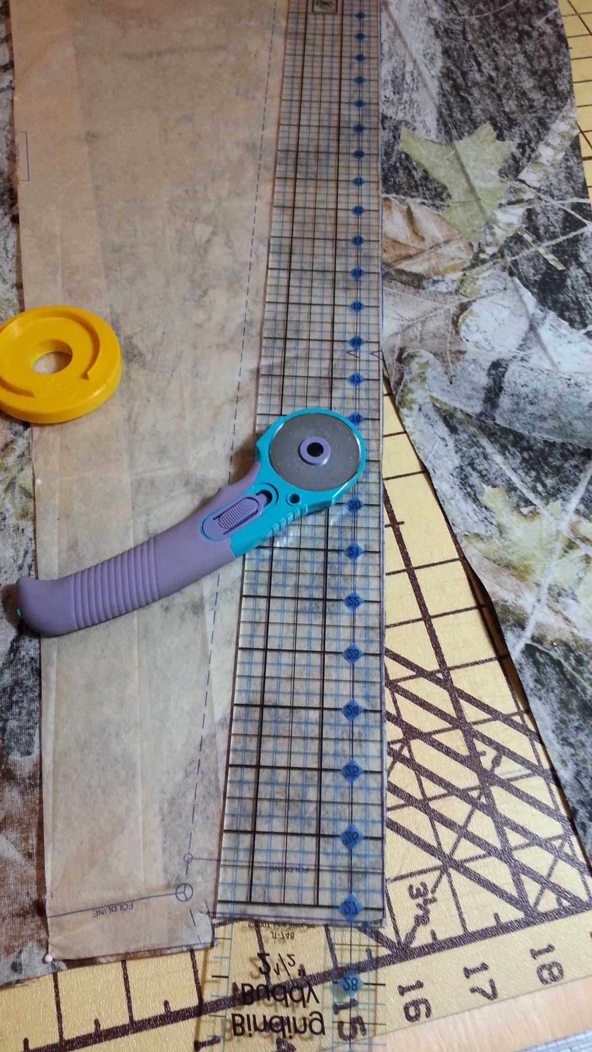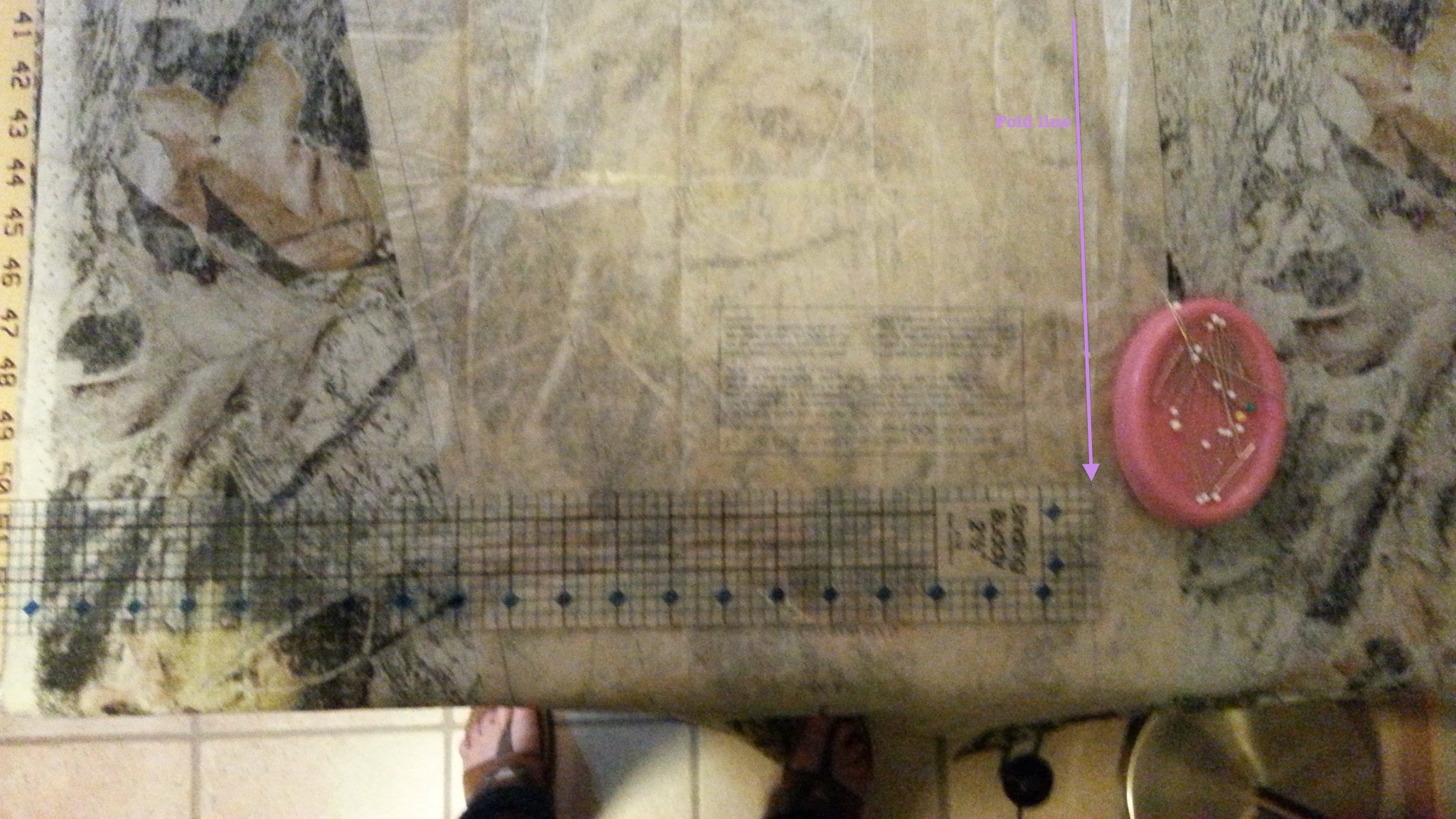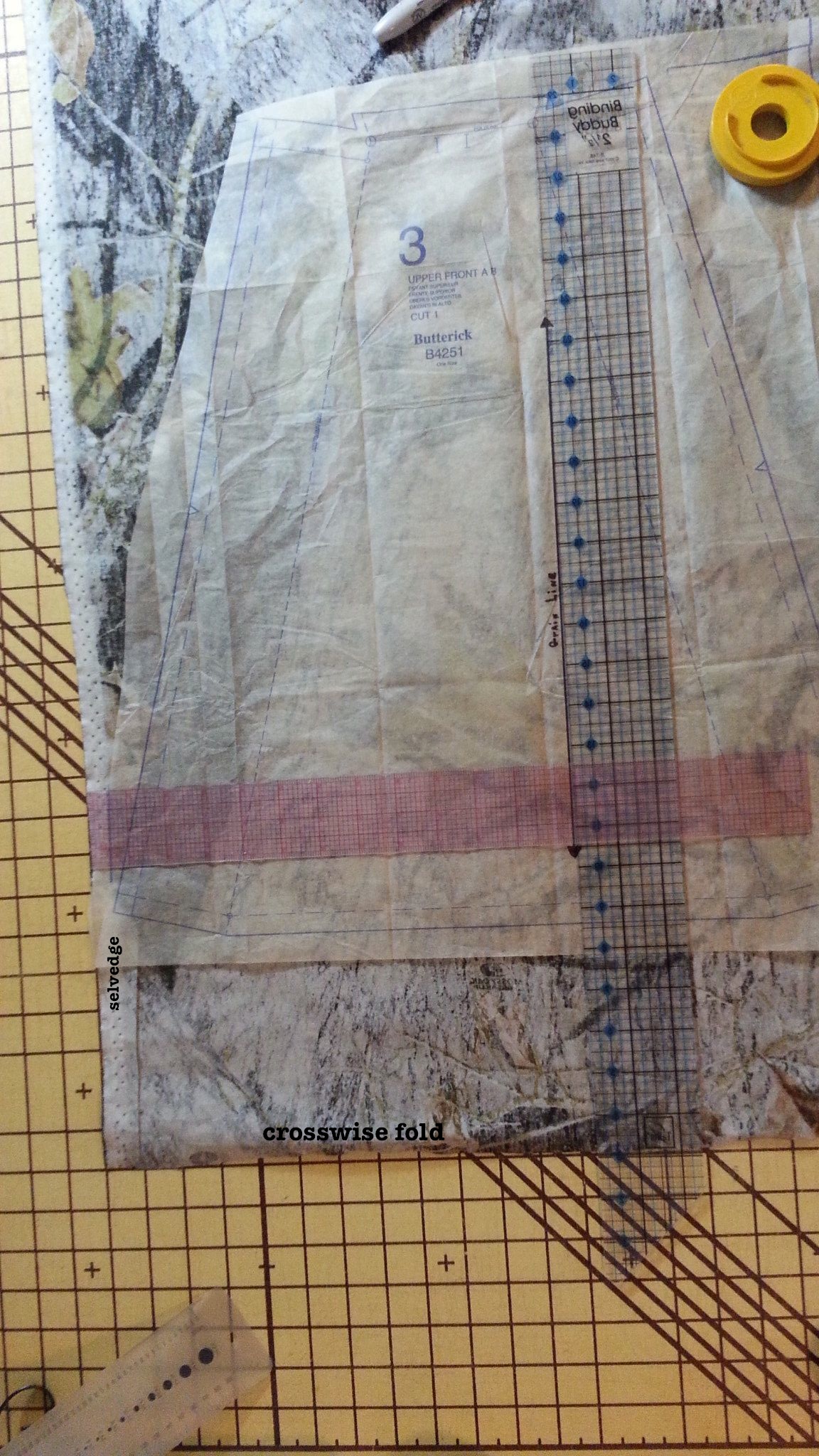Cut the first panel side DO NOT CUT ON FOLD/GRAINLINE See how the pin at the bottom of the photos extends? That is to remind me not to cut down that pattern edge.