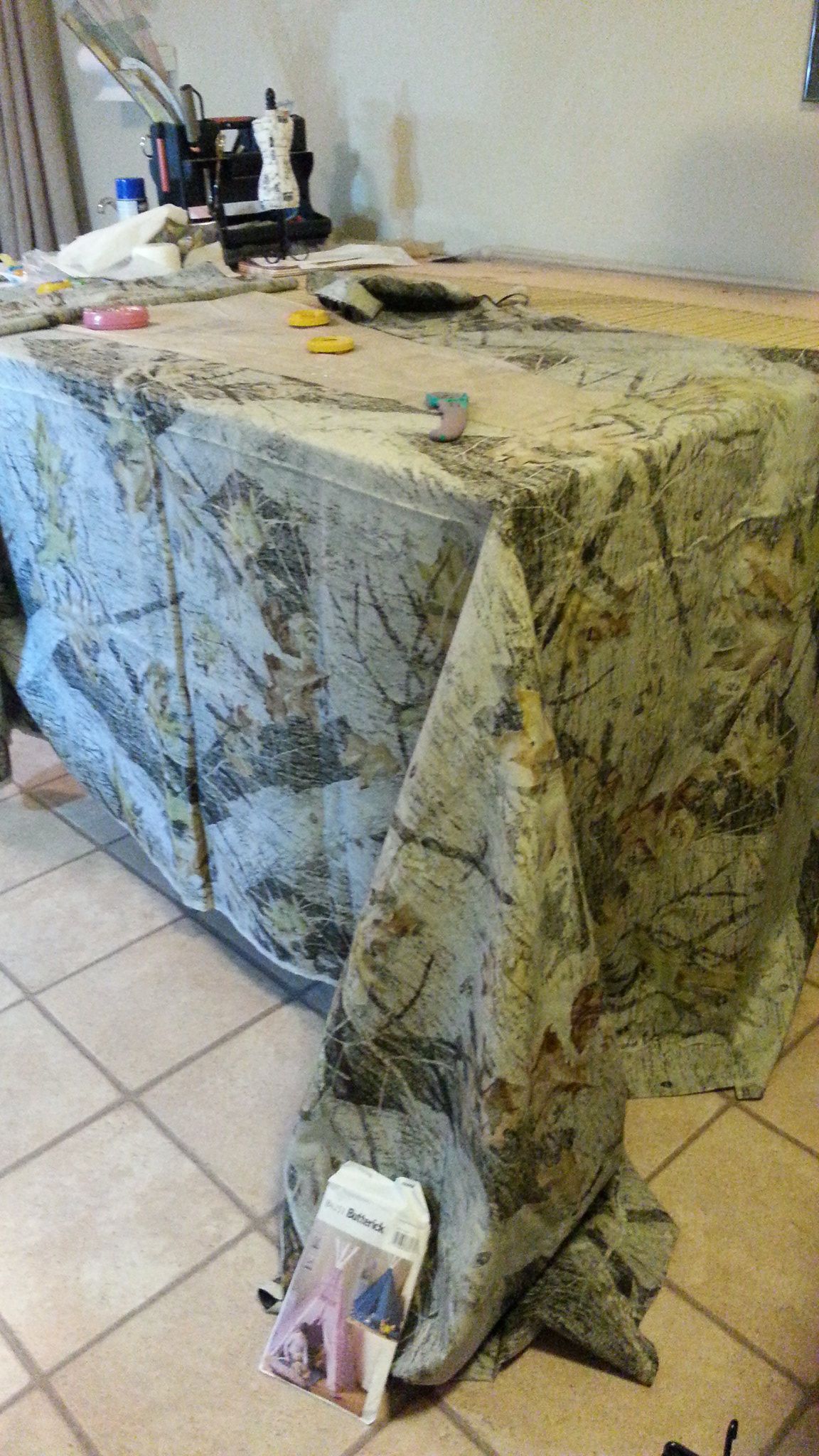Folding the fabric on the crossgrain (per layout guide) and matching the selvedges was an exercise in futility; finally stood on a stool and managed to declutter everything in the room when shaking fabric into place. That’s a quick way to clean the tabletops.