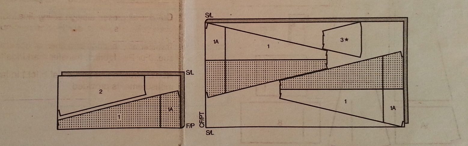 There are six cut pieces’ #2 and #3 are for the front opening panel; #1 is for the other five panels, and it has an extension, 1A, to add for the extra length. Pattern fabricators probably couldn’t make one pattern piece the desired length, and/or it was more economical to make two pieces. Whatever, it is another piece to the puzzle.