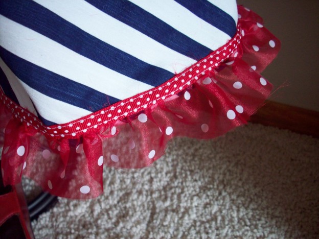 This basic skirt needed some life so added a sheer polka dot hem ruffle embellished with polka dot ribbon on the outside and red, white, blue striped ribbon on the inside. When you sit, the wrong side of the hem always shows; now it is a pretty as the right side! The original belt has been replaced with polka dot grosgrain ribbon–to wear or not.